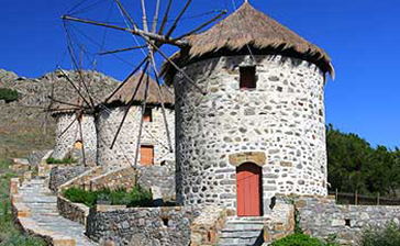 Kontiàs: il paese più bello dell'isola, luogo d'origine dei piccoli armatori di un tempo, con molti mulini a vento quasi in rovina, splendide dimore signorili in pietra, gemme dell'architettura locale, e una distilleria di ouzo.