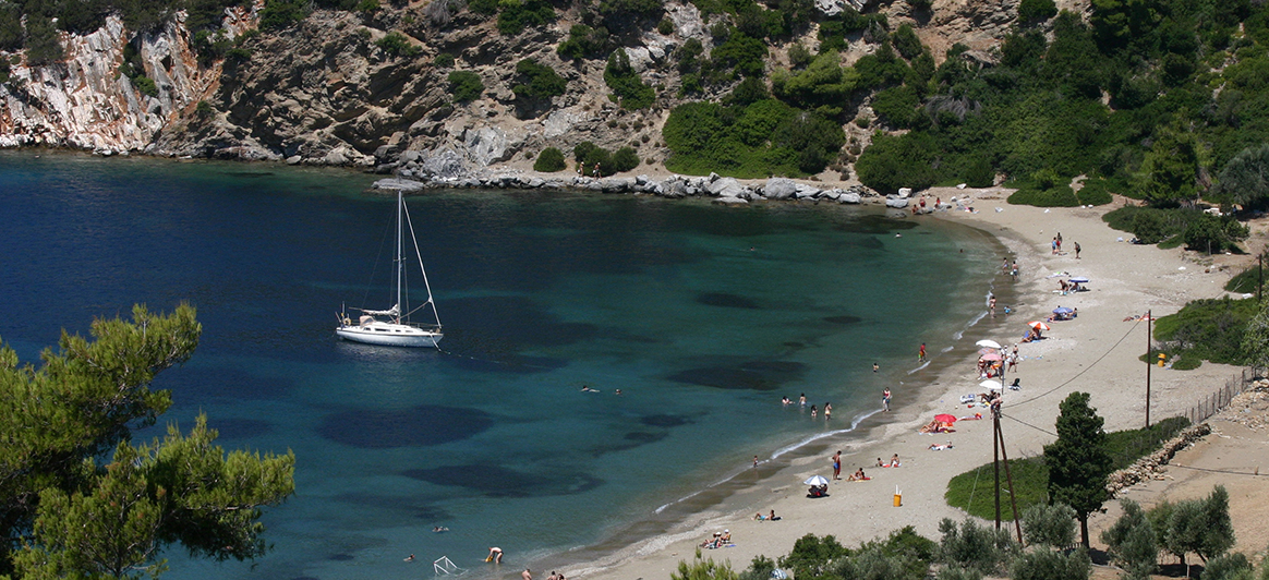 Spiagge: Skyros ha molte spiagge, tuttavia alcune di esse hanno il privilegio unico di essere deserte anche in agosto! Quella più battuta è la grande spiaggia a forma di ferro di cavallo che collega i villaggi di Molos e Magazià, sottostanti a Chora. In generale, la maggior parte delle spiagge di Skyros è deserta, l'ideale per rilassarsi e stare tranquilli. Vale la pena fare il bagno a Palamari, a fianco dell'omonimo sito archeologico, a Ghyrismata, ad Aghios Petros nella pineta di Atsitsa, ad Aghios Fokàs, a Kyrà-Panaghià e a Theotokos come anche a Pefkos, Kalamitsa, Renes, Acherounes e a Karefloù, quando non soffia il vento del nord.