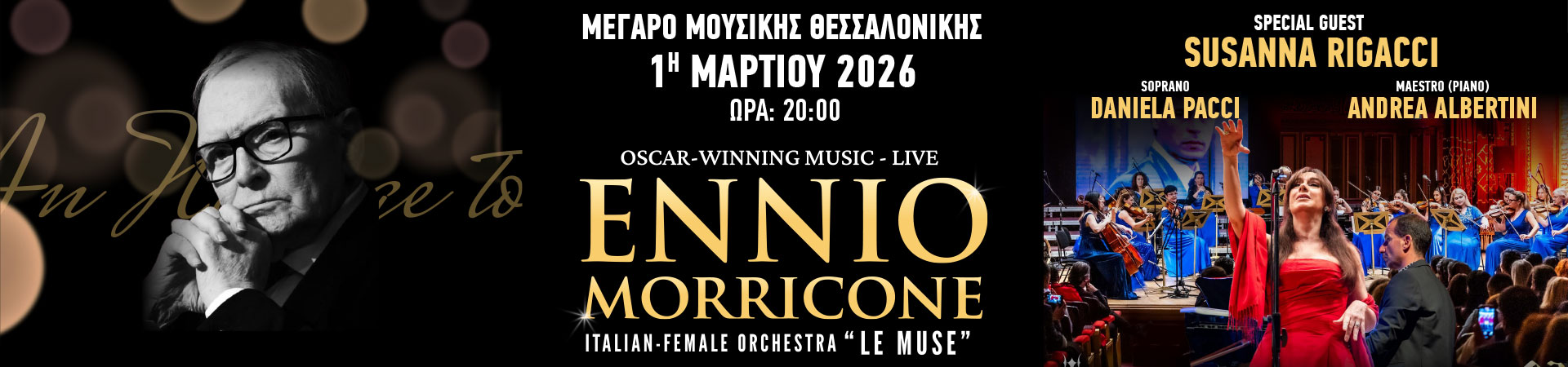 The world-famous melodies of the great Italian composer and conductor Ennio Morricone, from films such as Cinema Paradiso, The Mission, Malena and many more, take center stage in this concert performed by the Italian all-female orchestra “LE MUSE”, featuring Morricone’s unique diva Susanna Rigacci, who accompanied him in his concerts for over 20 years.