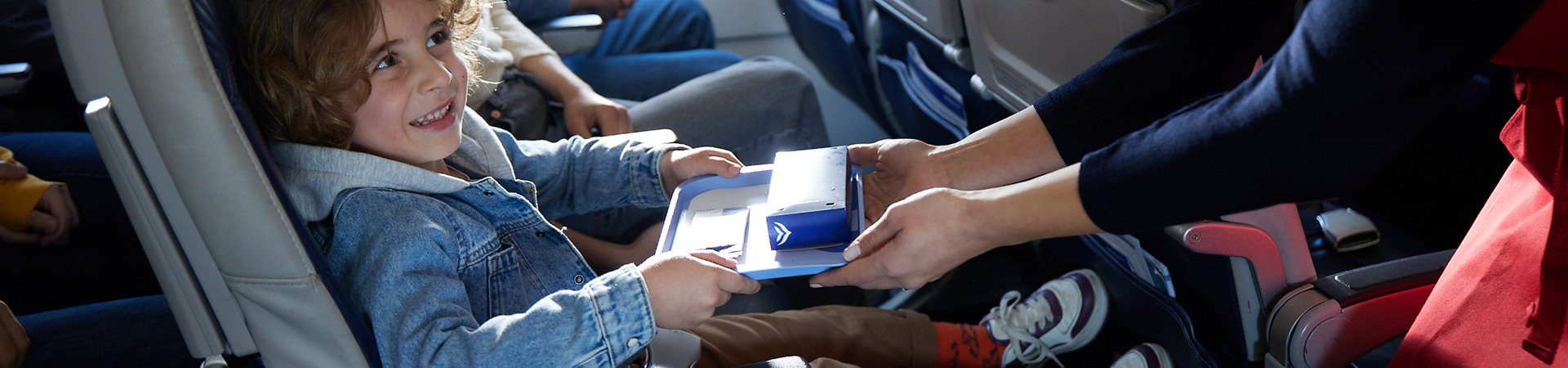 I nostri piccoli passeggeri avranno un pasto dedicato sui voli internazionali. Il pasto speciale per bambini è caldo o freddo, a seconda della durata del volo, e include suggerimenti semplici ma deliziosi e sapori familiari per i nostri piccoli amici.Se viaggi all'estero, il pasto per bambini sarà disponibile sul tuo volo e non dovrà essere ordinato in precedenza.