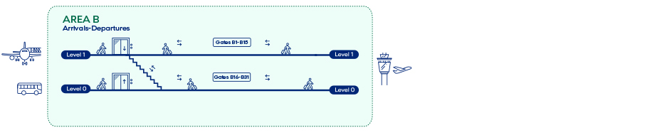 - Gate B16-B31: situati al Piano 0 un volo Schengen nell'Area B, segua queste istruzioni passo-passo in base a come avviene il suo sbarco.